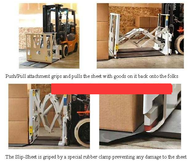 首先叉車是要經(jīng)過改裝的插齒變成一塊整體光滑的平板并且一般要求材質(zhì)304不銹鋼,然后就是要加裝一個(gè)液壓推擠裝置。推擠裝置有一個(gè)類似卡子的東西可以卡住滑托盤。